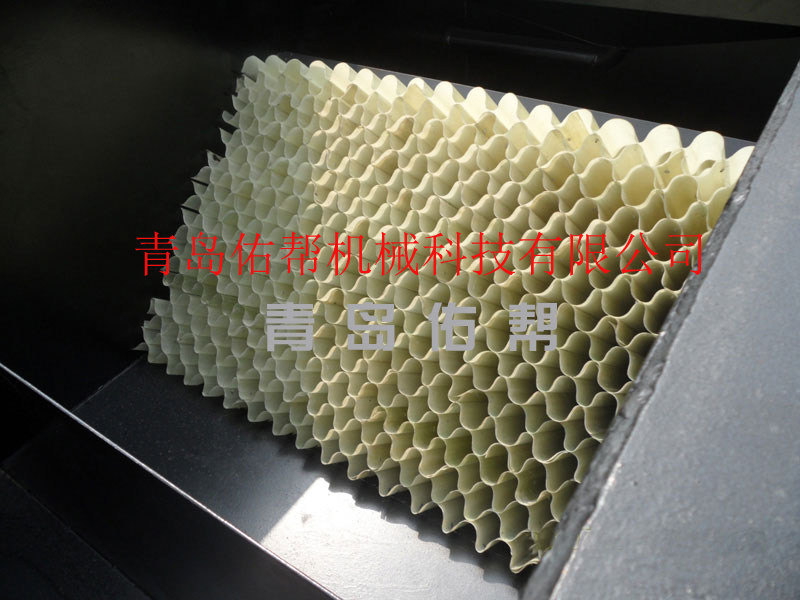 根據(jù)淺池理論發(fā)展而來的斜板隔油池,是一種異向流分離裝置,其水流方向與油珠運(yùn)動方向相反,廢水沿斜板向下流動,經(jīng)過斜板和沉淀區(qū)域后,通過溢流堰排出池體。廢水中密度特別小的油珠在斜板粘附聚集后,沿斜板下表面向上流動,含油浮渣會自流進(jìn)集油槽,或經(jīng)過刮渣機(jī)推送到集油槽內(nèi),經(jīng)管道排出。密度相對比較大的懸浮顆粒等會沉降到斜板上表面,污泥聚集到一定程度,會沿斜板滑落到池體底部的集泥槽內(nèi)。斜板材質(zhì)一般為玻璃鋼材料,表面光滑、均勻。安裝方法大多采用波紋板峰對峰的方式,中間形成的空隙即為污水流經(jīng)的通道。